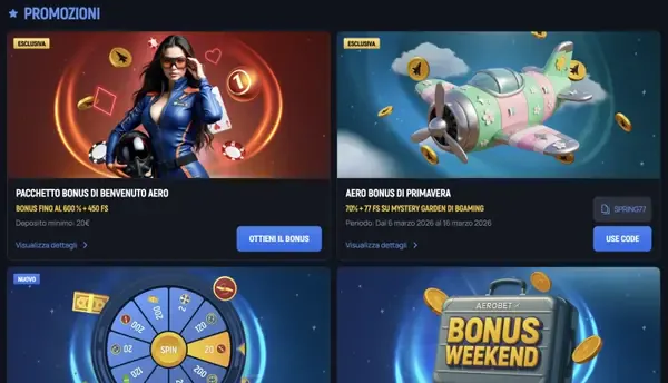 Gestiamo anche offerte settimanali e giornaliere pensate per i giocatori attivi, oltre a tornei di slot con montepremi. Ogni promo ha il proprio requisito di attivazione (come un deposito minimo) e può essere limitata a una volta al giorno o una volta a settimana. Il tuo prossimo bonus Aerobet può dipendere dal calendario promo e dalla valuta scelta (EUR per l’Italia). Vedi l’elenco aggiornato qui sotto e apri la pagina della promo per i termini completi.